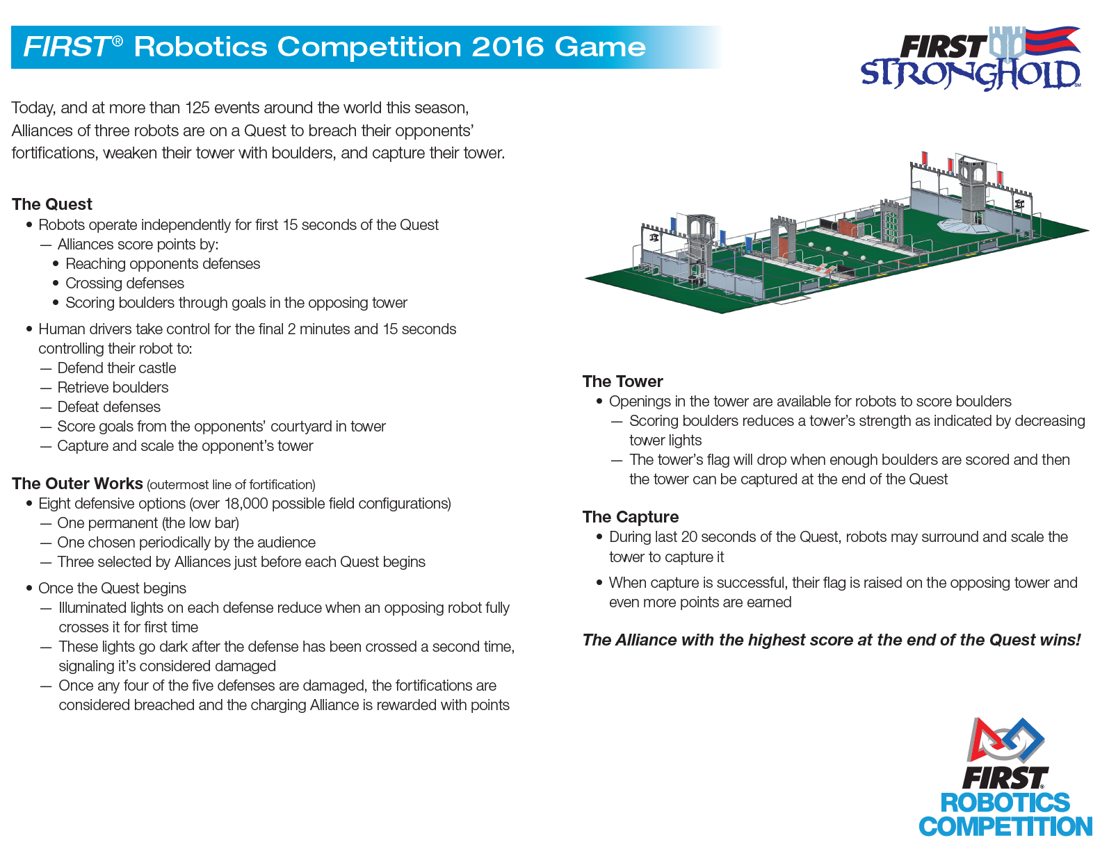 Alliances score points by reaching opponents defenses, crossing defenses, scoring boulders through goals in the opposing tower. In teleop Human drivers take control for the final 2 minutes and 15 seconds controlling their robot to defend their castle, retrieve boulders, defeat defenses, score goals from the opponents’ courtyard in tower, capture and scale the opponent’s tower. During last 20 seconds of the Quest, robots may surround and scale the tower to capture it